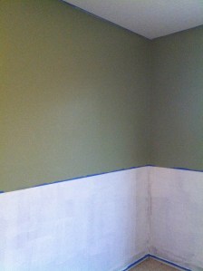On a serious note, Angel was so proud to paint the nursery (though he wouldn’t admit it).  My brother and sister-in-law offered a couple of times to come help paint since I couldn’t and Angel was always quick to say “well I don’t mind.”  So far he’s taken down wallpaper, repaired walls, primed, and painted the sage green on top:
