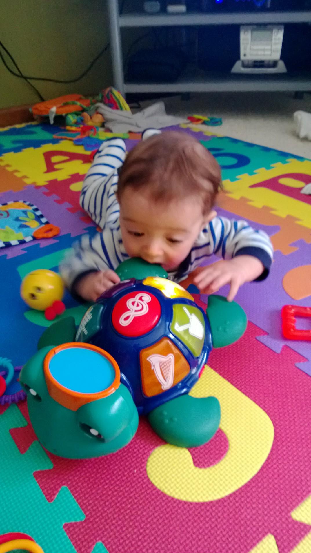 I crafted a wreath for the front door. I’ve been meaning to since we moved in but haven’t gotten around to it. So last week I went and got the materials for it and while talking about crafting to my sister, she sent me a photo of the wreath that I was planning on making but hers had different flowers that I totally liked better. So this weekend I went and exchanged my flowers and made my wreath while Lucas was busy crawling backwards: