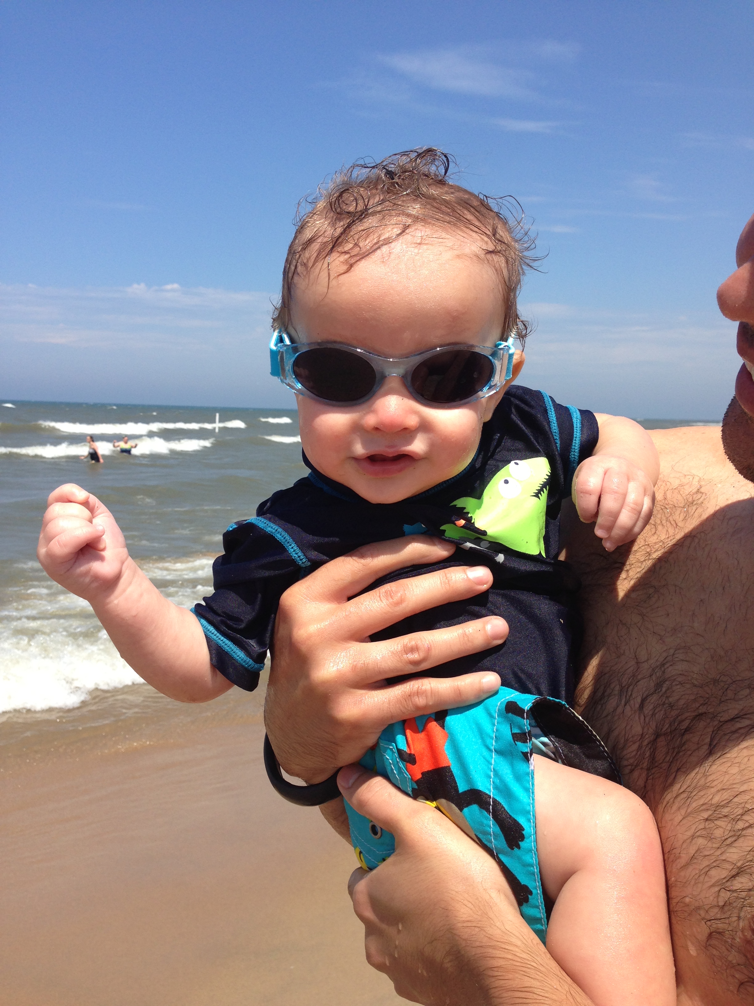 In the midst of this teething fest, we took Lucas to the beach and into the lake. It was soooo much fun, but unfortunately was extremely windy so the sand became little death pellets that I had to shield Lucas from. Other then that, he loved the water and Daddy was laughing with him in the waves, which melts my little Mommy heart. You know what else melts my heart? This face and those sunglasses!
