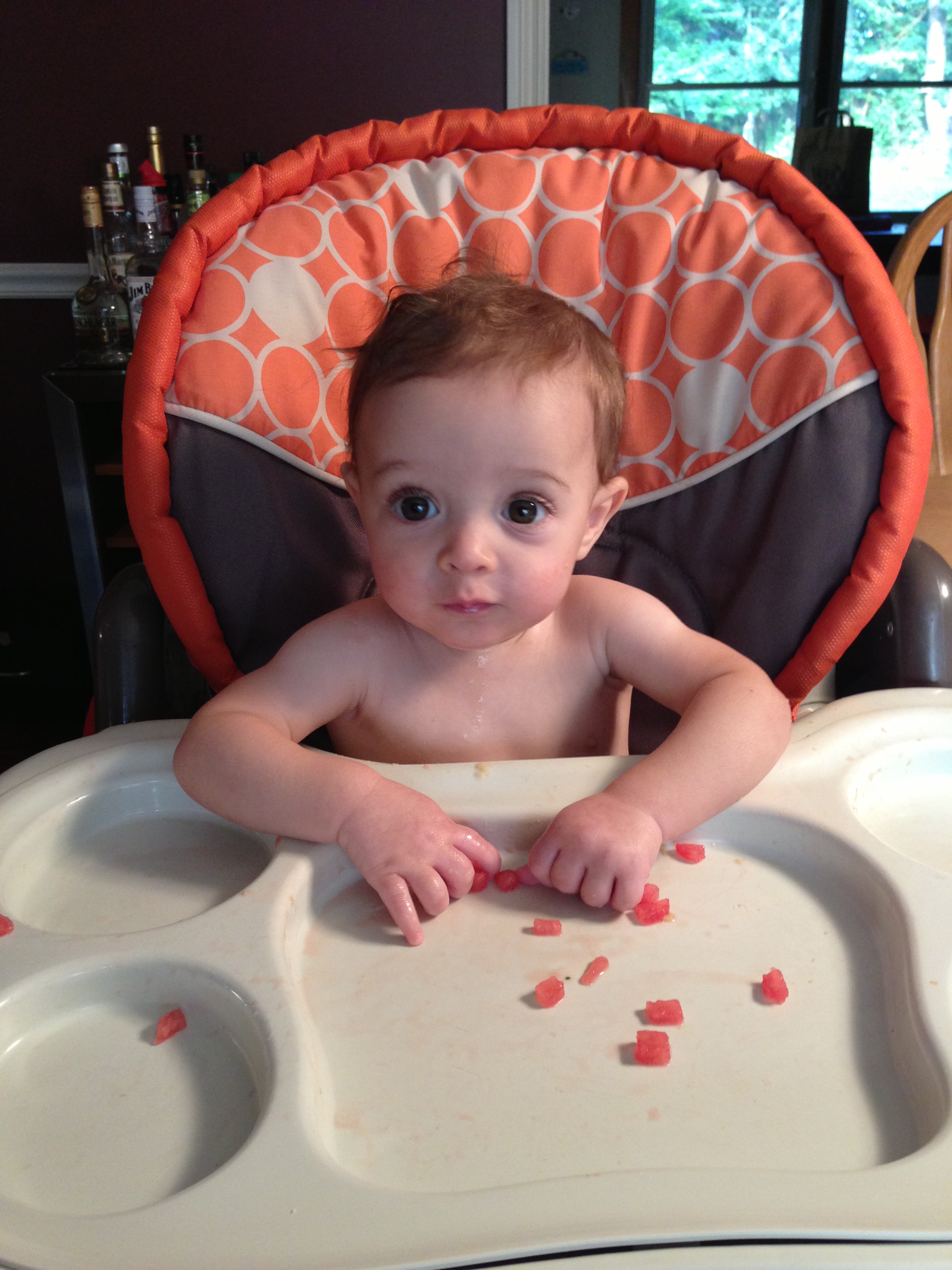 Watermelon, avocado, ground turkey- he’s on it. And I imagine that I’ll stop worrying about him choking on his food 6 years from never. It’s best to feed him while totally naked and right before bath time on a tile floor. Little man is meeeeeeessssssssssy!!