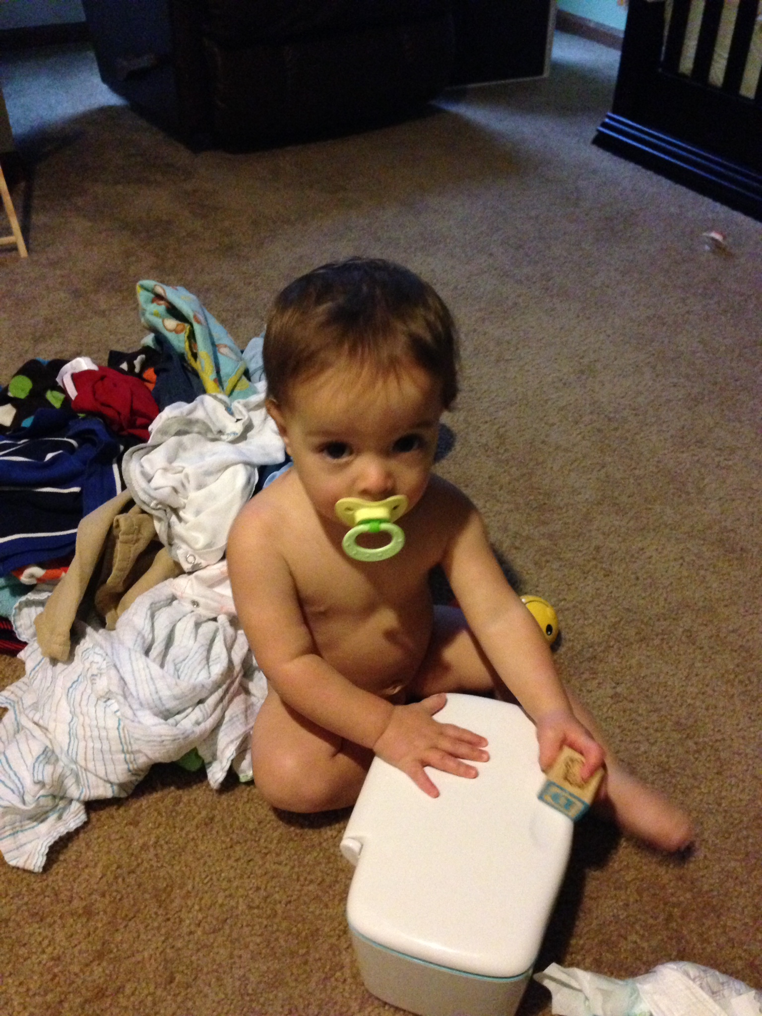 Yesterday Lucas learned a new word: no. I was changing his diaper on the floor of his bedroom when he rolled away from me and started playing with his toys, butt naked. I didn’t mind until he started playing in the pile of clean laundry, at which point I stopped him because I didn’t want to wash the laundry again. I said (in my sweetest mom voice): “Lucas. Can I put a diaper on you?” He looked at me, said “no” and turned and walked away towards his pacifier.