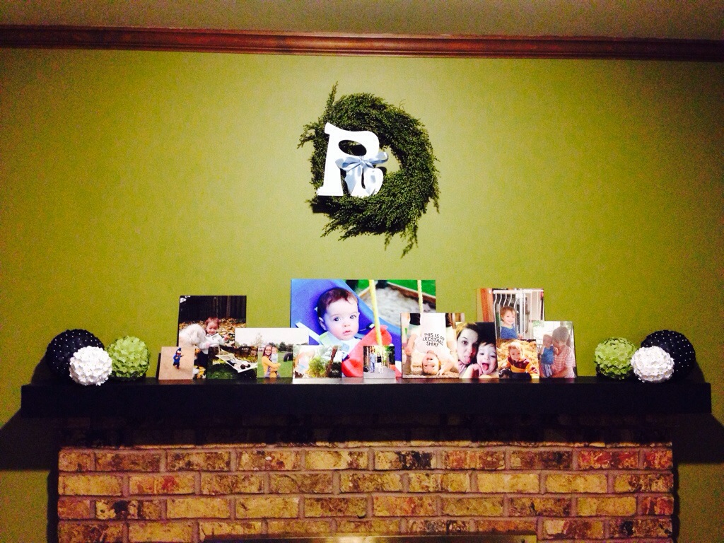 I finished crafting my mantle. Disregard the wall color, soooo not my choice and clearly doesn’t match any decor in our house. Mmm…. Pea soup.