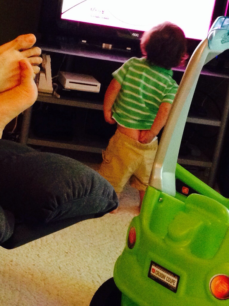And day 48: this dude just cracks me up. In this photo, he’s as close to the TV as possible watching Mickey Mouse with his hand so far down his diaper that it’s coming off. He walked around the room to play after this with some serious plumbers crack while I just laughed and laughed. Boys- it’s nature.