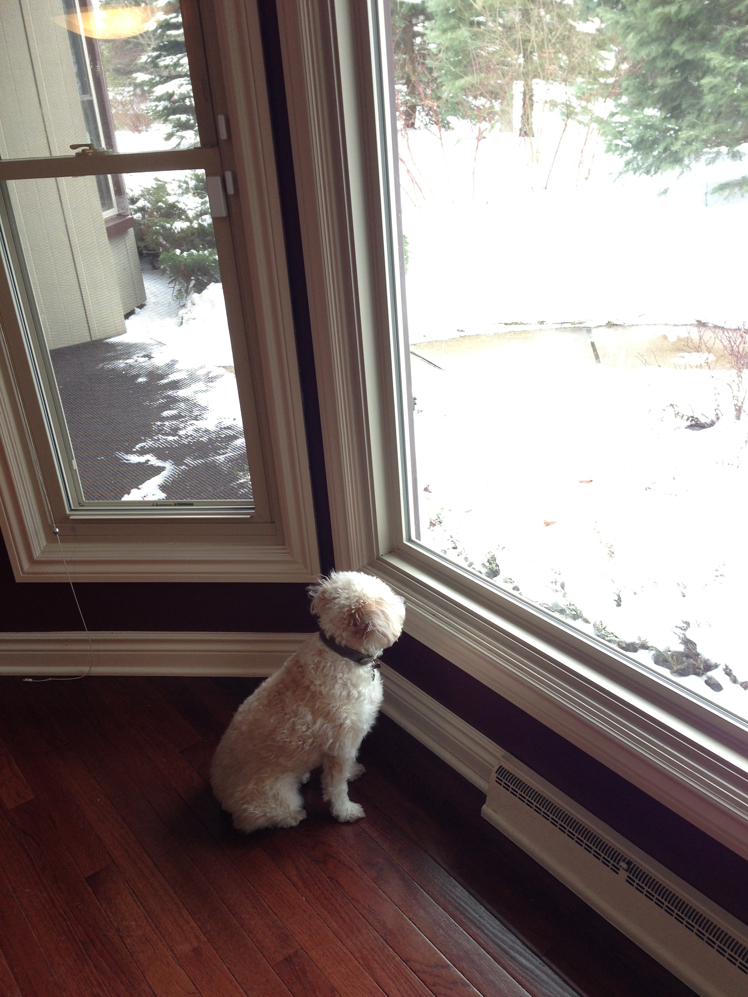 Next, Molly has learned that both the front windows are her height and that we have chipmunks in our yard. It’s a loud combination and she’ll sit here by the hour during the day waiting for them: