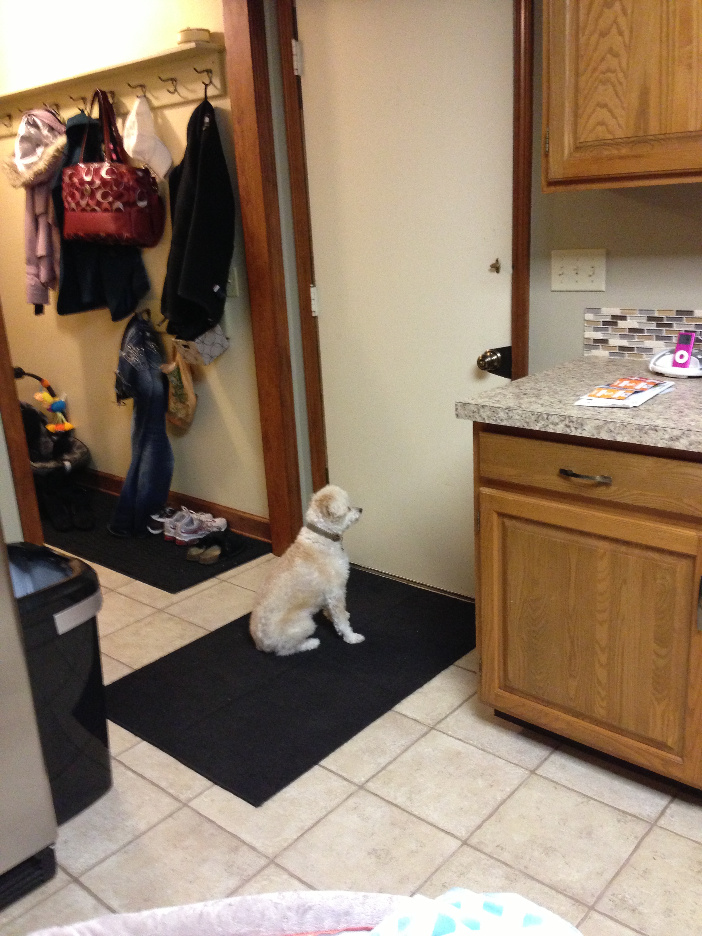 Next, she’s also learned the new house alarm beeps. In our house in Arizona the beep for the garage door was different but she knew that it meant we were home. In this house there’s no garage door beep, so she’ll wait for him by the front window (above) and then when she sees his car pull into the driveway, she immediately runs to wait by the garage door because DAD’S HOME!